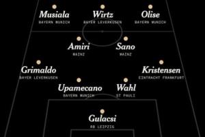 中场:穆西亚拉(拜仁)、阿米里(美因茨)、维尔茨(勒沃库森)、佐野海舟(美因茨)、奥利塞(拜仁)